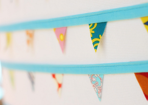 - A fűzér alapjának szánt pánt nyitott szélét hosszában kezdjük levarrni úgy, hogy közben a hajtásba egymástól kb. 5 centinként bevarrjuk a zászlókat is.
