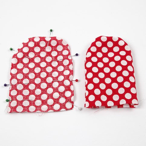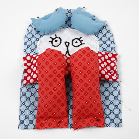 - Helyezzük el a már kitömött részeket az egyik testen, színt színre. Gombostűzzük vagy férceljük le őket, nehogy az összeillesztésnél elmozduljanak.