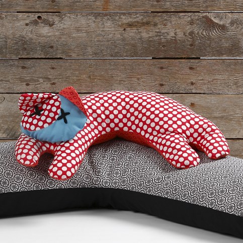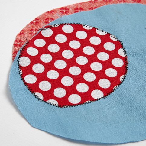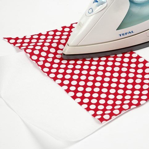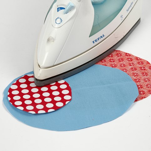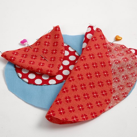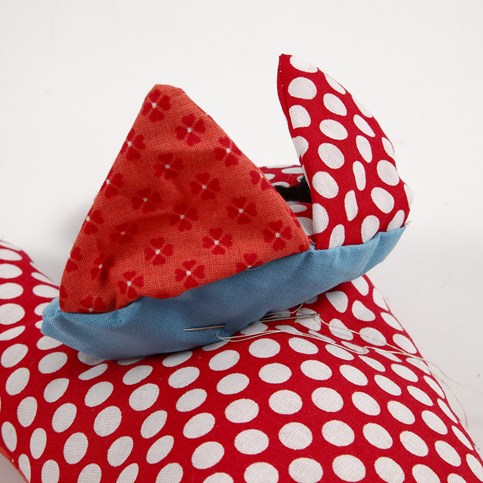 2. A fejrészen található folthoz kiválasztott anyag hátsó felére vasaljunk ragasztós közbélést, szabjuk ki a foltot majd cikk-cakk öltéssel rögzítsük a pofihoz.
