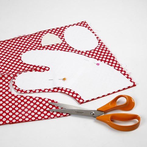 1. Nyomtassuk és vágjuk ki a test, fej és fül szabásmintákat, majd 1cm-es varrásráhagyással szabjuk ki darabokat.