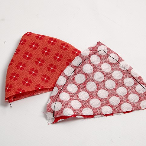 3. Színt színre fordítva varrjuk össze a fülek első és hátsó részének két felső oldalát, fordítsuk ki, majd vasaljuk le.