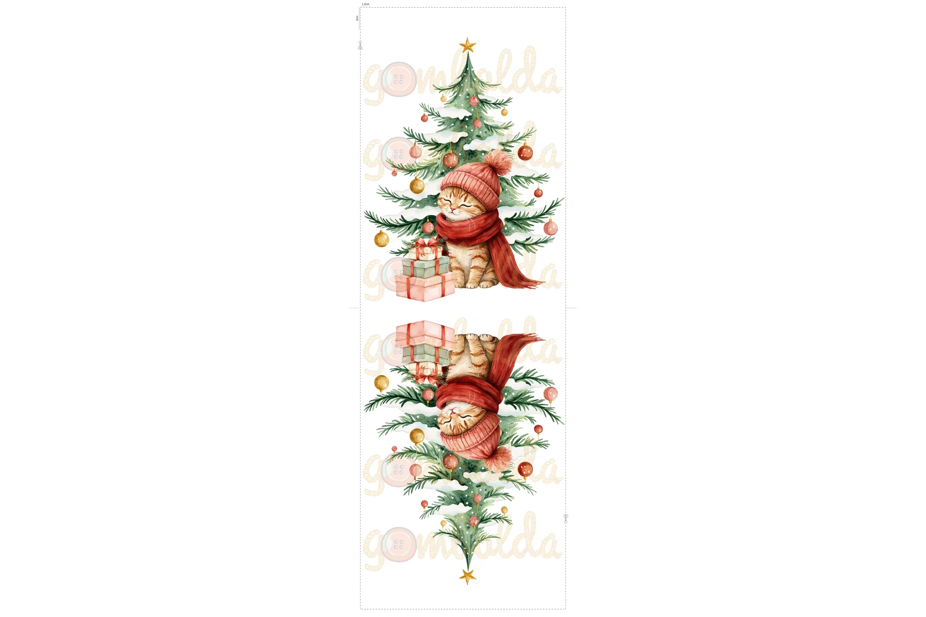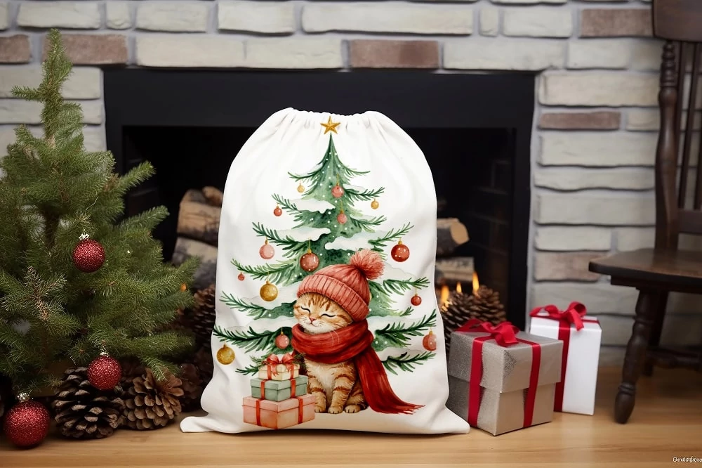 Panama szövet Mikulás zsák panel - festett karácsony - piros cica