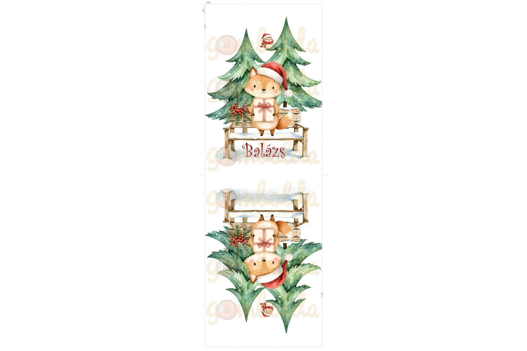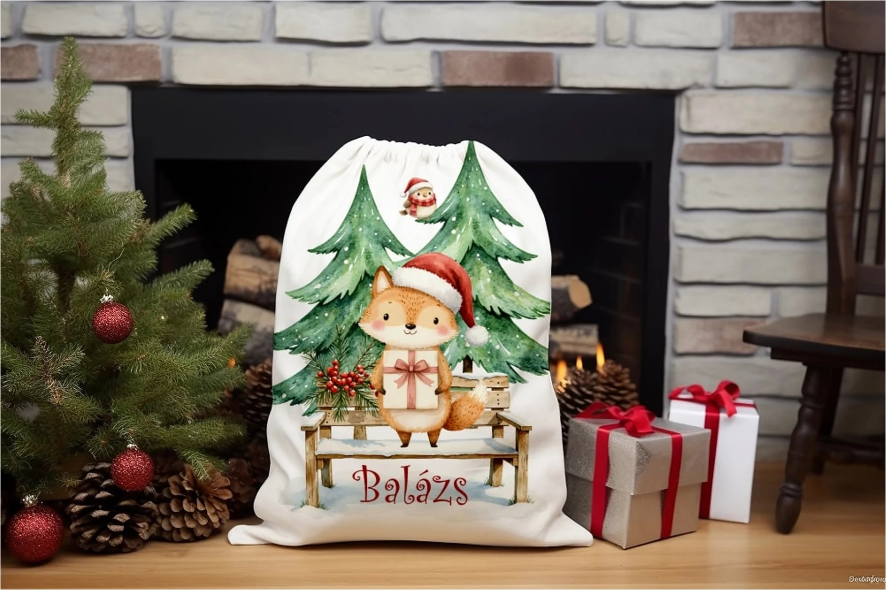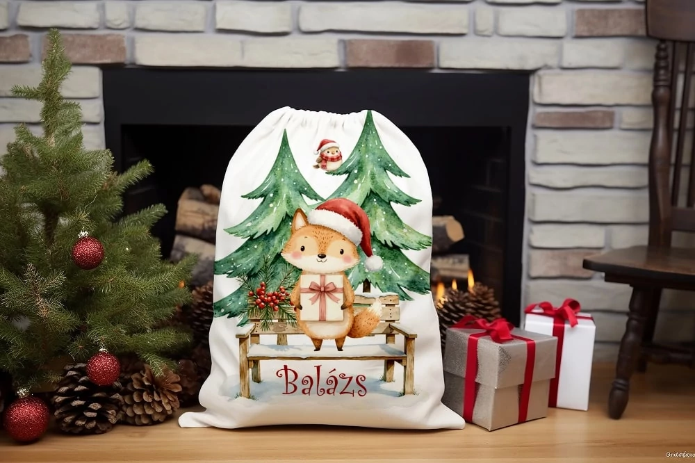 Panama szövet Mikulás zsák panel NÉVVEL - festett piros róka