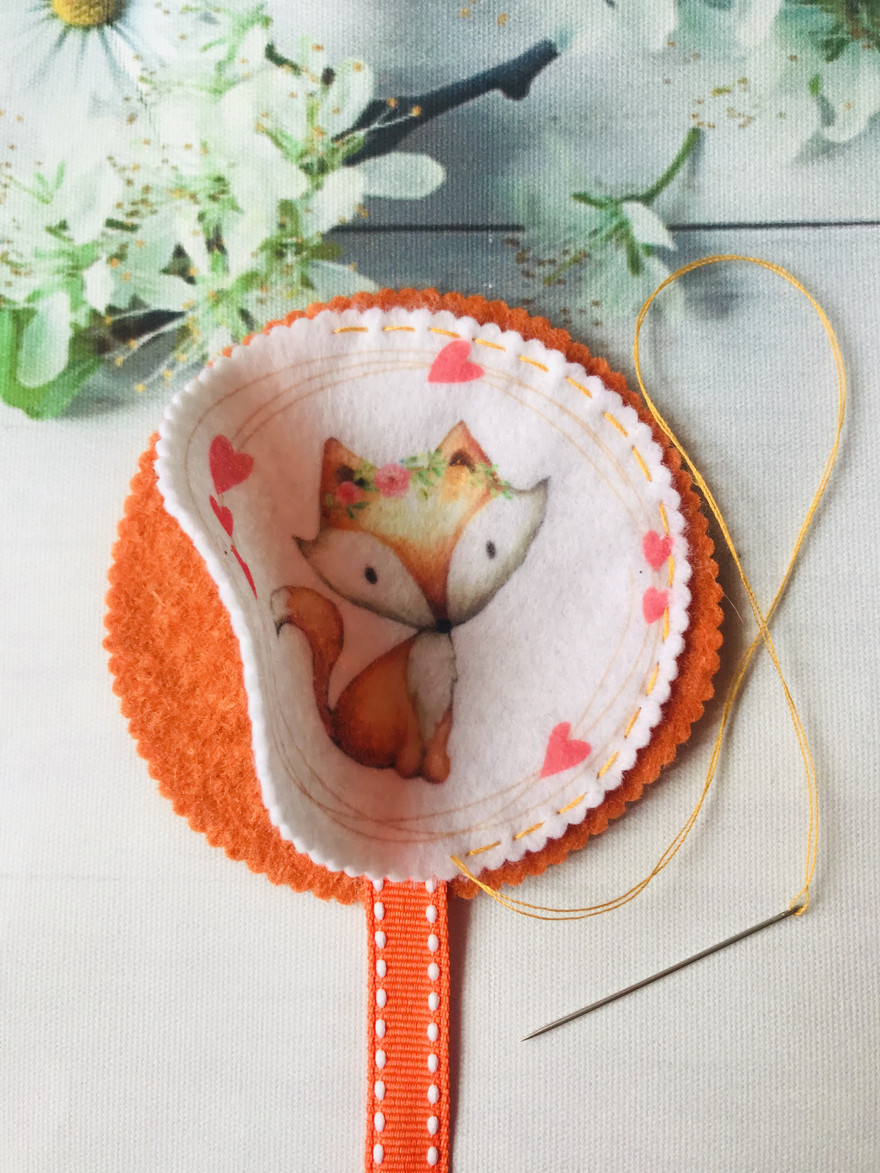 A kivágott mintás filcet ráhelyezem a fél centivel nagyobb narancssárga filcre. A fehér filc fonák felőli oldaláról felszúrok a tűvel , amibe narancs színű varrócérnát fűztem duplán, majd apró öltésekkel elkezdek lefelé haladni.