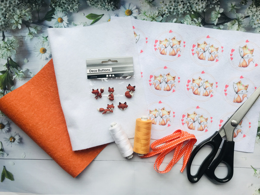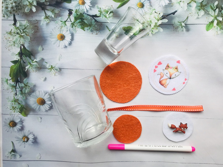 A mintás filcből kivágom az egyik róka mintát , amihez most hullámos ollót használtam. A kivágott filckarikát ezután ráhelyeztem a narancssárga filcemre , és nagyjából fél centivel nagyobb kört vágtam ki. Ezekből fog elkészülni a könyvjelzőnk felső része. Az alsó részét egy feles pohár segítségével ugyanígy kivágtam a fehér és a narancs filcekből. Végül levágtam egy kb. 15 centis szalagot.