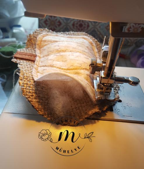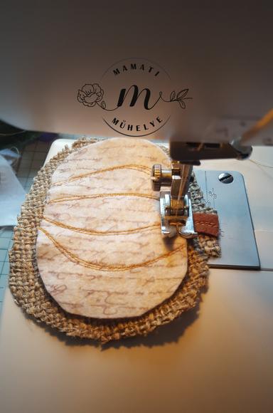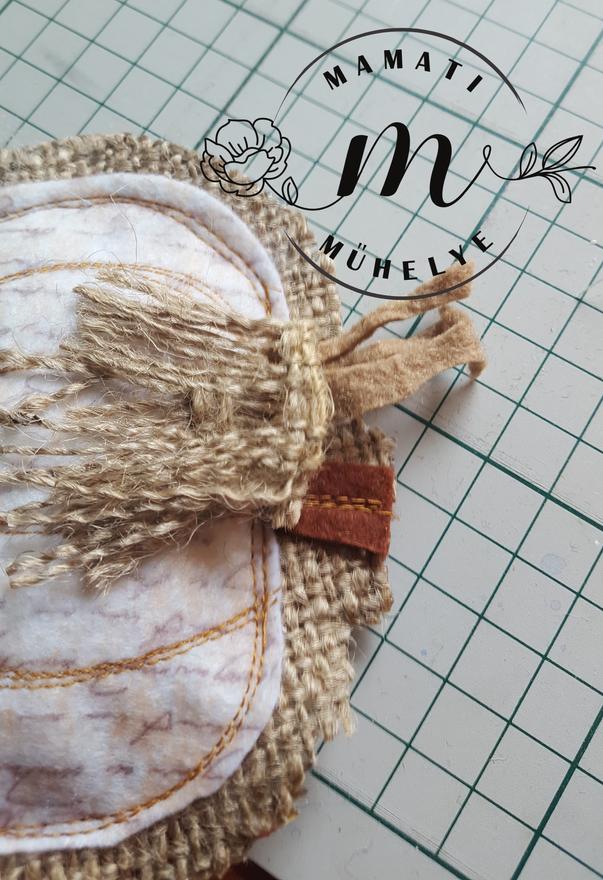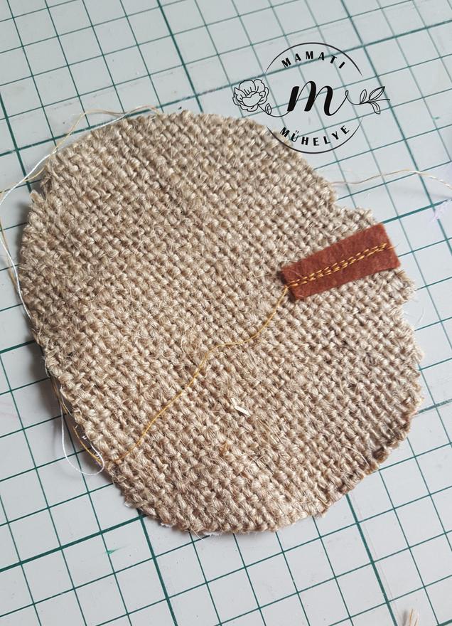 Majd ezután rávarrom a tököt a megszáradt jutavászon formára, varrás közben kevés tömőanyagot tuszakolok bele.
